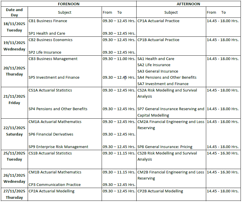 The Institute of Actuaries of India (IAI) has officially released the timetable for the November 2025 Actuarial Examinations.